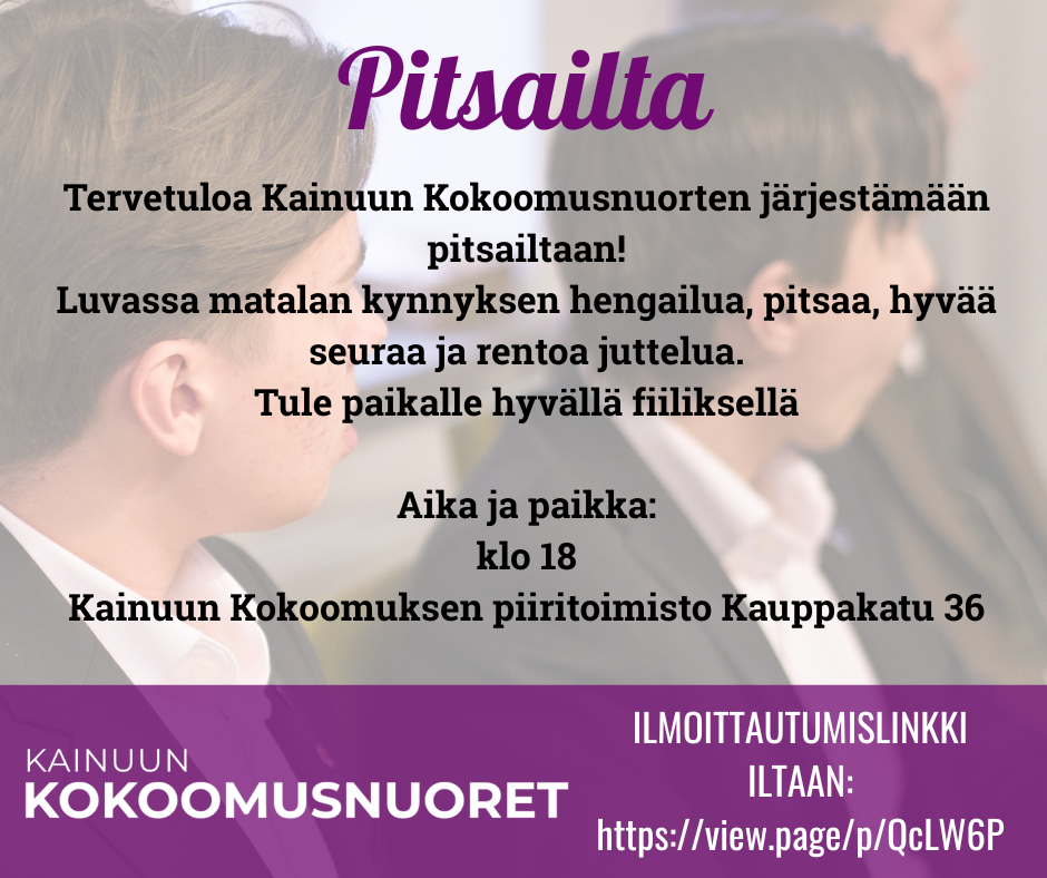 Kainuun Kokoomusnuoret järjestää pizzaillan perjantaina 27.2.2026 klo 18 Kainuun Kokoomuksen piiritoimistolla Kauppakadulla Kajaanissa!