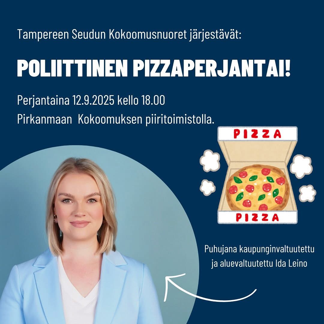 Nyt on elämäsi tilaisuus. Nimittäin sinulla on mahdollisuus osallistua syksyn yksistä parhaimmista tapahtumista.🤩 Tampereen Seudun Kokoomusnuorten poliittiset pizzaperjantait käynnistyvät perjantaina 12.9.2025 kello 18.00. Paikkana on Pirkanmaan Kokoomuksen piiritoimisto osoitteessa Kuninkaankatu 13 B.