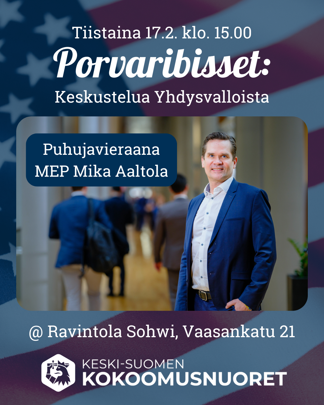 Tapahtuma järjestetään ravintola Sohwin kabinetissa tiistaina 17.2. klo 15.00 eteenpäin. Tapahtuma on avoin kaikille kokoomusnuorille ja kokoomusnuorista kiinnostuneille 💙