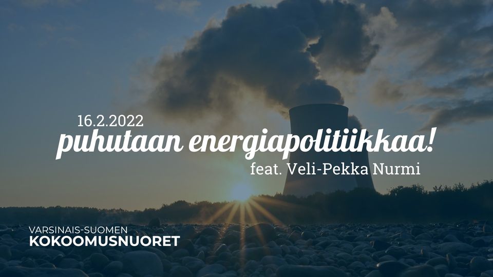 16.2.2022 Varsinais-Suomen Kokoomusnuoret saavat puhujavieraakseen erittäin mielenkiintoisen henkilön – meille saapuu nimittäin kertomaan energiapolitiikasta Veli-Pekka Nurmi, joka on juuri aloittanut uusissa työtehtävissä Teollisuuden Voiman turvallisuusjohtajana. Erityisesti mieltänne askarruttavia kysymyksiä ydinvoimasta kannattaa siis tulla esittämään!