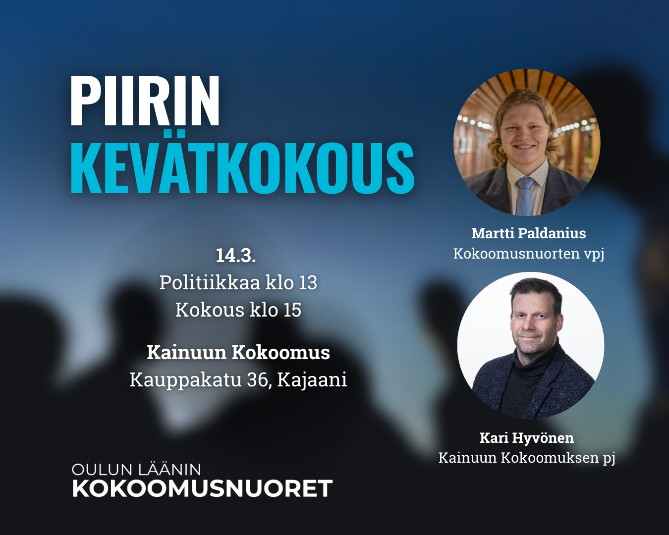 Ennen kokousta on klo 13 alkaen tarjolla lounasta ja politiikkaa, kun vieraaksemme saapuvat Kokoomusnuorten varapuheenjohtaja Martti Paldanius sekä Kainuun Kokoomuksen puheenjohtaja Kari Hyvönen. Tule ja Tutustu -tilaisuus on sinulle, joka haluat tietää lisää kokoomusnuorista ja kokoomuslaisesta mielenmaisemasta Kainuussa tai vaikuttaa piiristämme lähetettäviin puoluekokousaloitteisiin. Tilaisuus on oiva mahdollisuus verkostoitua nuorten kokoomuspoliitikkojen kanssa, kun paikalle saapuu myös kokoomusnuorten Oulun vaalipiirin eduskuntavaaliehdokas Lotta Ellonen.
